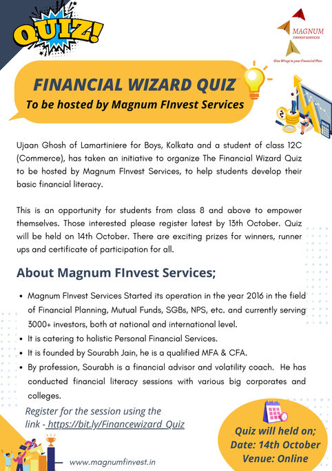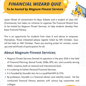 Join us for The Financial Wizard Quiz, presented by Magnum FInvest Services, designed to nurture essential financial literacy skills. This opportunity is open to students from Class 8 and above, offering a chance to empower themselves. Secure your spot by registering before October 13th, and mark your calendars for the quiz on October 14th. Prizes await the champions and runners-up, and all participants will receive a certificate of participation. Don't miss this chance to boost your financial knowledge – register now and embark on your path to financial wizardry!